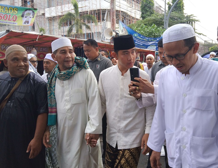 Gibran berjalan menuju arah utara di Jl Kapten Mulyadi, Solo. Gibran didampingi beberapa habaib. Sejumlah jemaah yang melihat keberadaan Gibran langsung meminta foto.