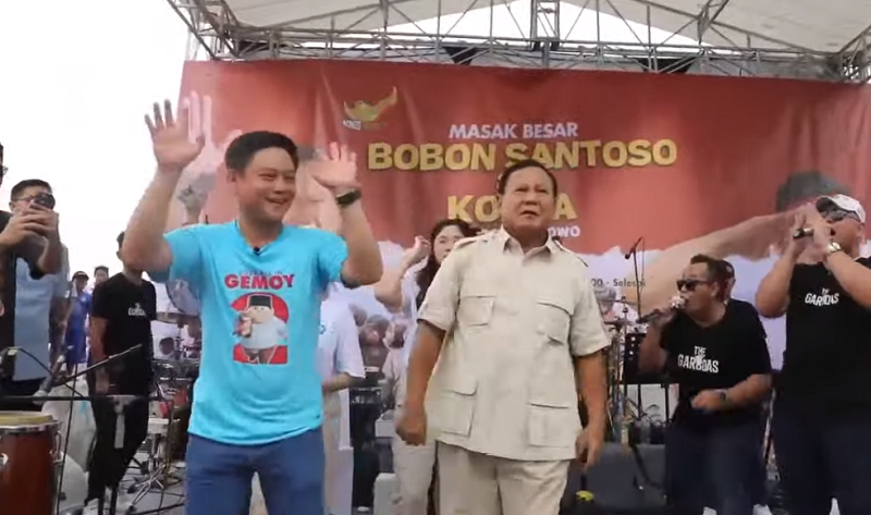 Acara Masak Besar bersama youtuber chef Bobon Santoso dan Relawan Konco Prabowo (Kopra) meriah dengan joged gemoy andalan Prabowo sambil melambaikan tangan ke warga.