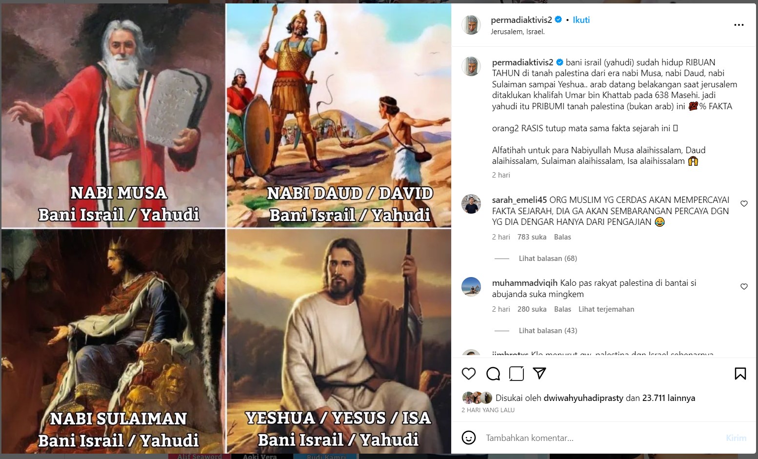 Salah satu narasi yang diperjuangkan oleh beberapa pihak adalah pandangan Permadi Arya, seorang aktivis sosial media yang mengklaim bahwa Bani Israil (yahudi) adalah pribumi tanah Palestina sejak zaman nabi Musa, Daud, Sulaiman, hingga Yeshua. Menurutnya, Arab datang belakangan, pada saat Jerusalem ditaklukkan oleh Khalifah Umar bin Khattab pada tahun 638 Masehi. "Bani Israil (yahudi) sudah hidup RIBUAN TAHUN di tanah Palestina dari era nabi Musa, nabi Daud, nabi Sulaiman sampai Yeshua.. Arab datang belakangan saat Jerusalem ditaklukkan Khalifah Umar bin Khattab pada 638 Masehi. Jadi, yahudi itu PRIBUMI tanah Palestina (bukan Arab) ini 💯% FAKTA," ujar postingan Instagram Permadi Arya.