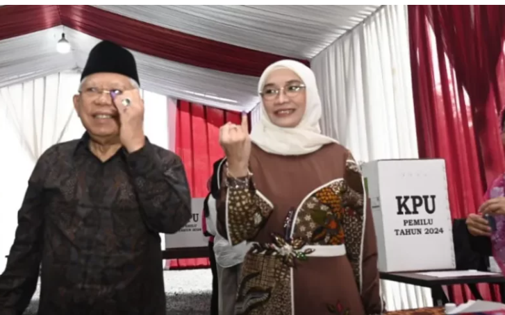 Wapres Ma’ruf Amin bersama istri Wury Ma’ruf Amin menggunakan hak pilih (mencoblos) pada Pemilu 2024, di TPS 033, Tapos, Cimanggis, Depok, Jawa Barat, Rabu pagi.
